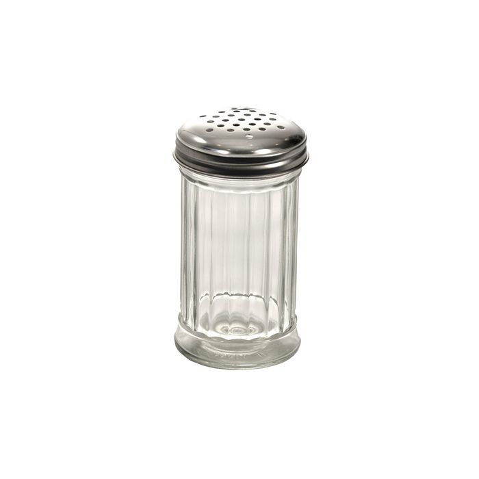 Classic style look cheese shaker. Perforated cap. Flat bottom. Vertical ridged lines. Glass base with screw on metal top. Dishwasher safe under normal conditions. Glass with Stainless Steel top.