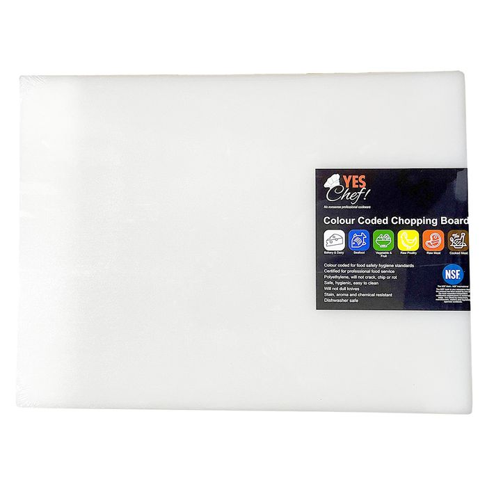 NSF Approved Commercial-Grade Cutting Board Made from high-quality polyethylene (PE), this NSF-approved cutting board is built to meet the demands of busy kitchens while prioritising safety and hygiene. Safe and hygienic: Resists stains, odours, and chemicals for a cleaner prep space. Knife-friendly: Gentle on blades, keeping them sharp and ready to use. Easy to maintain: Dishwasher safe for effortless cleaning. Size: 508mm x 381mm