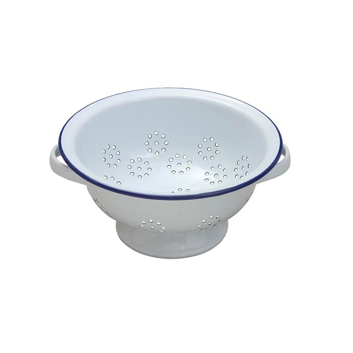 Colander, Enamelware, White, 24cm The classic look, this colander in traditional white with blue rim is a kitchen essential.