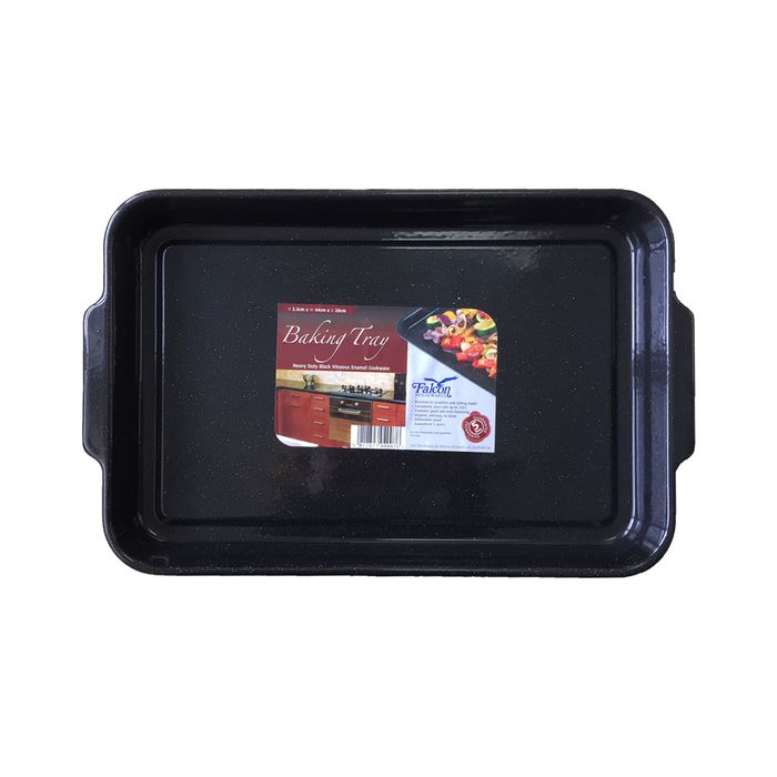 Perfect to roast those potatoes. As well as timeless elegance, Falcon Enamelware has enduring strength. Enamelware is porcelain fused onto heavy-gauge steel, giving it many admirable qualities - durability, smoothness, and chemical-resistance. It can assume brilliant, long-lasting colours, and cannot burn. If you drop it, it may chip but it won’t break. Dishwasher-safe and oven-safe up to 530F / 270C, it can also be used on gas and electric hobs. Features: Baking Tray Rectangular Enamelware. Colour: Black Speckled. Size: 44cm.