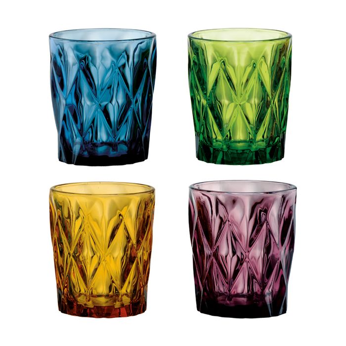 85x85x100mm/30cl Highgate has a fantastically complex design, where the sloping gradient within the diamond design creates a highly tactile finish. Dimensions: 85 x 85 x 100 mm Capacity: 30 cl Colour: Multi-coloured Substrate: Glass A fantastic and tactile set where each glass is a different colour Made from pressed glass, this is a practical and hardy range, ideal for use at home The colour of all four glasses is within the glass itself, and not sprayed on, making this range safe to use in the dishwasher. Comes gift boxed Designed by Artland