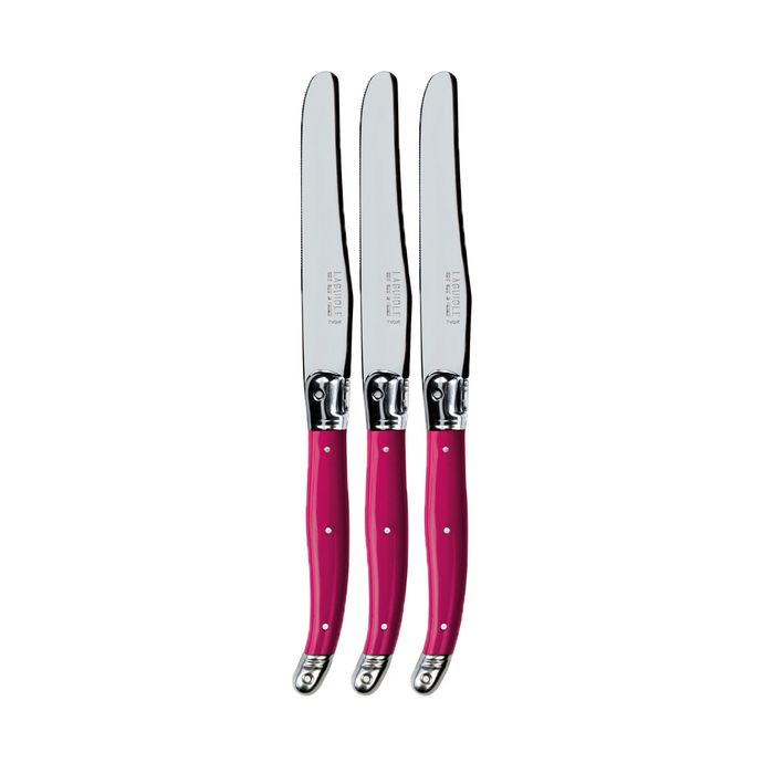 Andre Verdier Laguiole Table Knife - Fuchsia - Sold in 3s Verdier Cutlery is made in Laguiole, France by Andre Verdier. This Verdier table knife is made of stainless steel blades and resin handles, complete with the iconic Laguiole Bee. Authentic Laguiole Cutlery: 100% made in Laguiole, France by Andre Verdier. Stainless steel blades with coloured resin handles. Classic Laguiole Bee on each handle. Hand wash recommended Nice addition to your table knife collection, great addition to your tableware collection. Blade length: 110mm Overall length: 230mm