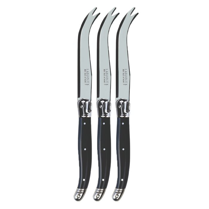 Andre Verdier Cheese Knife - Black - Sold in 3s The Laguiole pronged cheese knife, also known as a forked-tipped spear, is a versatile tool for cutting and serving cheese. Its narrow, upward-curled blade is designed to minimise sticking, making it perfect for soft to semi-hard cheeses. The pronged tip allows you to easily pick up and serve each piece. Crafted in Laguiole, France Made from stainless steel with handles made from coloured resin Features the trademark Laguiole Bee on handle Hand wash recommended Whether for casual entertaining or everyday use, these pronged cheese knives are an essential addition to any cheese board.