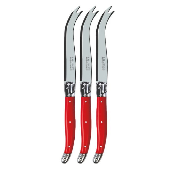 Andre Verdier Cheese Knife - Bright Red - Bundle of 3 The Laguiole pronged cheese knife, also known as a forked-tipped spear, is a versatile tool for cutting and serving cheese. Its narrow, upward-curled blade is designed to minimise sticking, making it perfect for soft to semi-hard cheeses. The pronged tip allows you to easily pick up and serve each piece. Crafted in Laguiole, France Made from stainless steel with handles made from coloured resin Features the trademark Laguiole Bee on handle Hand wash recommended Whether for casual entertaining or everyday use, these pronged cheese knives are an essential addition to any cheese board.