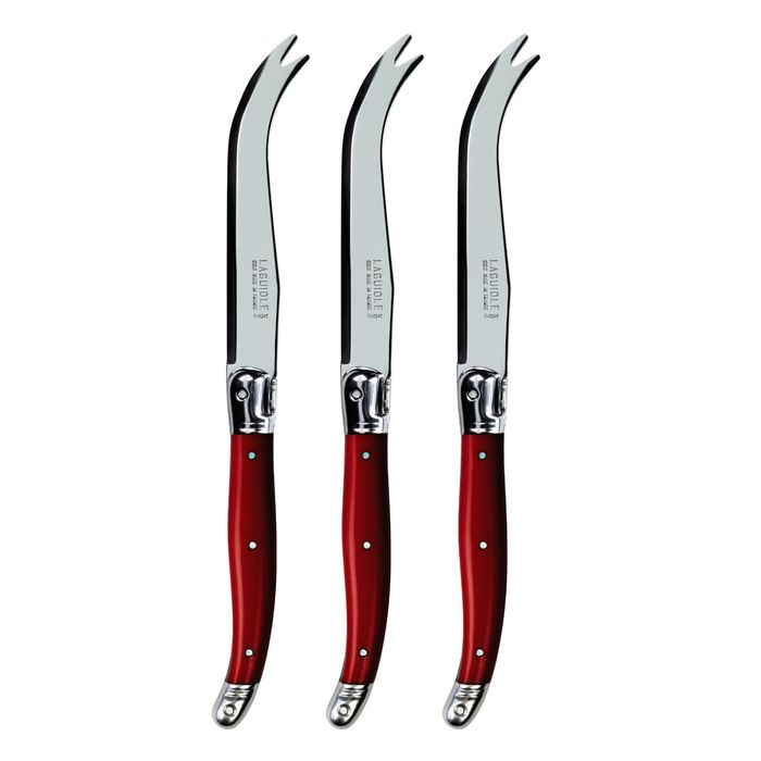 Andre Verdier Cheese Knife - Red - Sold in 3s The Laguiole pronged cheese knife, also known as a forked-tipped spear, is a versatile tool for cutting and serving cheese. Its narrow, upward-curled blade is designed to minimise sticking, making it perfect for soft to semi-hard cheeses. The pronged tip allows you to easily pick up and serve each piece. Crafted in Laguiole, France Made from stainless steel with handles made from coloured resin Features the trademark Laguiole Bee on handle Hand wash recommended Whether for casual entertaining or everyday use, these pronged cheese knives are an essential addition to any cheese board.