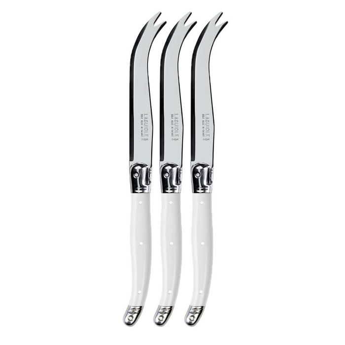 Andre Verdier Cheese Knife - White - Sold in 3s The Laguiole pronged cheese knife, also known as a forked-tipped spear, is a versatile tool for cutting and serving cheese. Its narrow, upward-curled blade is designed to minimise sticking, making it perfect for soft to semi-hard cheeses. The pronged tip allows you to easily pick up and serve each piece. Crafted in Laguiole, France Made from stainless steel with handles made from coloured resin Features the trademark Laguiole Bee on handle Hand wash recommended Whether for casual entertaining or everyday use, these pronged cheese knives are an essential addition to any cheese board.