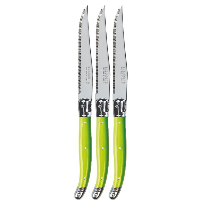 Andre Verdier Laguiole Steak Knife - Green - Sold in 3s Verdier Cutlery is made in Laguiole, France by Andre Verdier. This verdier steak knife is made of stainless steel blades and resin handles, complete with the iconic Laguiole Bee. Authentic Laguiole Cutlery: 100% made in Laguiole, France by Andre Verdier. Stainless steel blades with coloured resin handles. Classic Laguiole Bee on each handle. Hand wash recommended Nice addition to your steak knife collection, great addition to your tableware collection.
