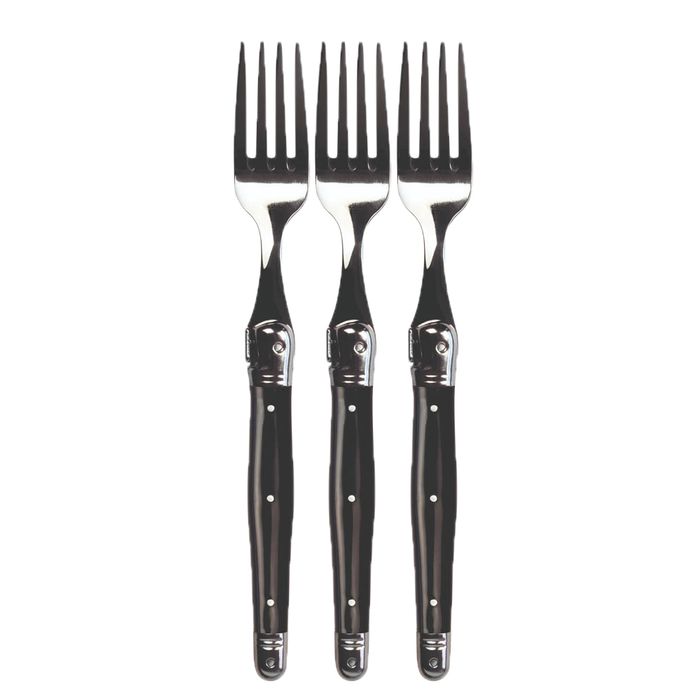 Andre Verdier Laguiole Fork - Black - Sold in 3s Verdier Cutlery is made in Laguiole, France by Andre Verdier. This Fork is made of stainless steel blades and resin handles, complete with the iconic Laguiole Bee. Authentic Laguiole Cutlery: 100% made in Laguiole, France by Andre Verdier. Stainless steel blades with coloured resin handles. Classic Laguiole Bee on each handle. Hand wash recommended Great addition to your tableware collection.