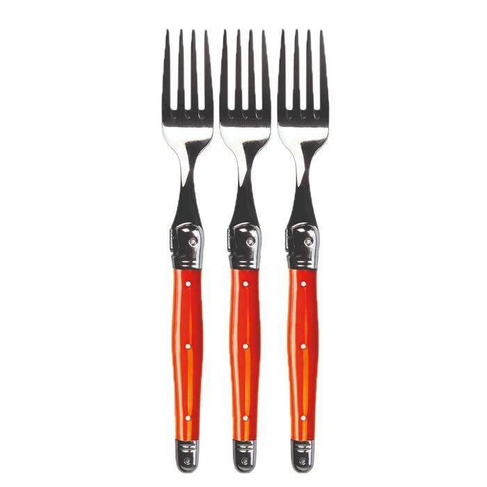 Andre Verdier Laguiole Fork - Orange - Sold in 3s Verdier Cutlery is made in Laguiole, France by Andre Verdier. This Fork is made of stainless steel blades and resin handles, complete with the iconic Laguiole Bee. Authentic Laguiole Cutlery: 100% made in Laguiole, France by Andre Verdier. Stainless steel blades with coloured resin handles. Classic Laguiole Bee on each handle. Hand wash recommended Great addition to your tableware collection.