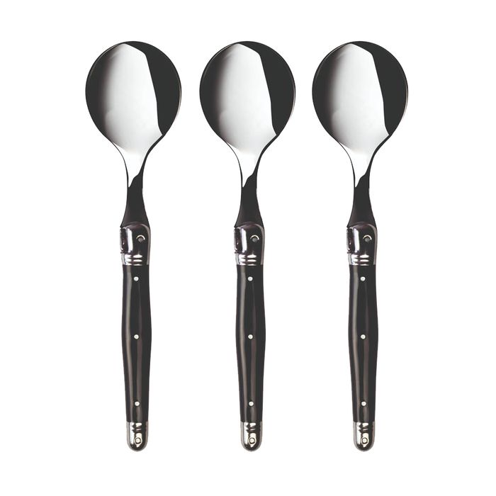 Andre Verdier Laguiole Soup Spoon - Black - Sold in 3s Verdier Cutlery is made in Laguiole, France by Andre Verdier. This Verdier Soup Spoon is made of stainless steel blades and resin handles, complete with the iconic Laguiole Bee. Authentic Laguiole Cutlery: 100% made in Laguiole, France by Andre Verdier. Stainless steel blades with coloured resin handles. Classic Laguiole Bee on each handle. Hand wash recommended Nice addition to your soup spoon collection, great addition to your tableware collection.