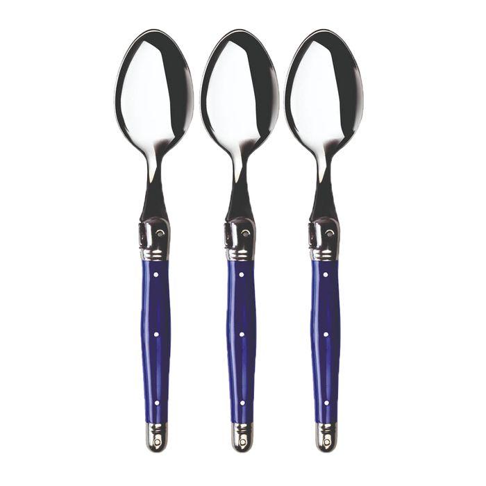 Andre Verdier Laguiole Dessert Spoon - Violet - Sold in 3s Verdier Cutlery is made in Laguiole, France by Andre Verdier. This dessert spoon is made of stainless steel blades and resin handles, complete with the iconic Laguiole Bee. Authentic Laguiole Cutlery: 100% made in Laguiole, France by Andre Verdier. Stainless steel blades with coloured resin handles. Classic Laguiole Bee on each handle. Hand wash recommended