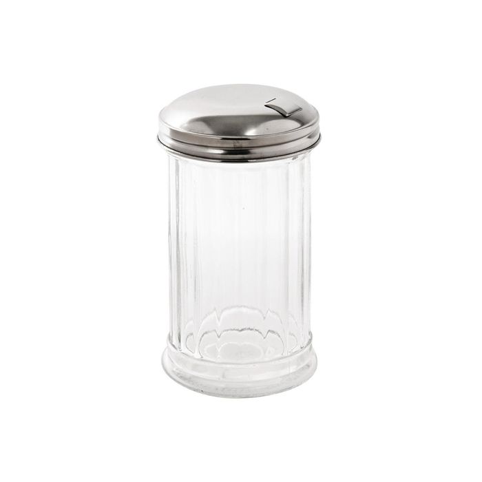 Fluted (vertical) lined glass design. Flat bottom. Excellent clarity allows patrons to quickly identify contents. Stainless steel top with self-closing side spout. Screw top lid allows for easy refills. Dishwasher safe under normal conditions.