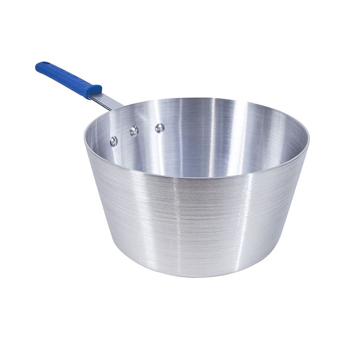 Please note lid sold separately Suitable for gas, electric and open fire cooking Not suitable for induction cooking Professional quality heavy gauge aluminium. Measuring 2.5mm thick, its durable construction ensures long-lasting performance through washing, storage, and constant heating, resisting warping and damage while maintaining its shape and effectiveness for years of reliable use. Heat-resistant ‘cool-touch’ silicone handles, providing chefs with a more comfortable and safer grip. Classic commercial design Strong riveted handle offers grip and stability for easy and safe lifting Brush finish Handwash recommended