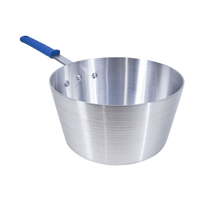 Please note lid sold separately Suitable for gas, electric and open fire cooking Not suitable for induction cooking Professional quality heavy gauge aluminium. Measuring 2.5mm thick, its durable construction ensures long-lasting performance through washing, storage, and constant heating, resisting warping and damage while maintaining its shape and effectiveness for years of reliable use. Heat-resistant ‘cool-touch’ silicone handles, providing chefs with a more comfortable and safer grip. Classic commercial design Strong riveted handle offers grip and stability for easy and safe lifting Brush finish Handwash recommended