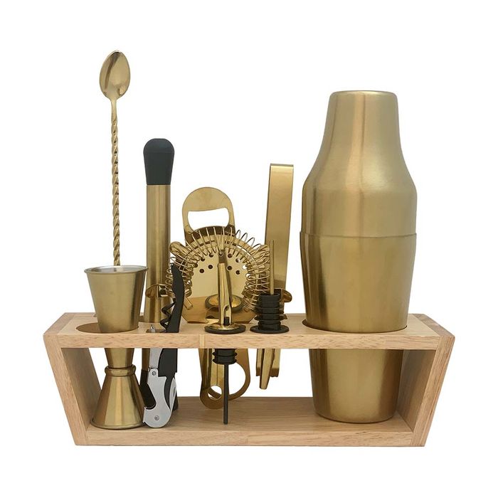 11 piece bar tool set attractively finished in durable PVD Gold Bar spoon with stud 275mm Japanese jigger 30/60ml Waiters friend opener 2 Speed pourers Muddler Speed opener Ice tong 4 Prong Strainer 2 Piece cocktail shaker Stylish wooden stand Boxed set Stainless steel construction Food grade, hygienic and durable Suitable for commercial or domestic use