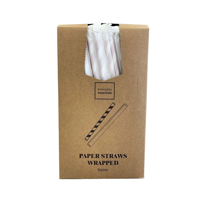 Packaged in handy carboard dispensing boxes of 250 straws Individually wrapped straws Dimension 6mm dia x 197mm length 120 + 120 + 60 GSM paper Food grade soy-bean ink colouring Red and white twisted Stripe design - colour (186c) 250 straws per kraft paper box 20 boxes per carton 5000 staws per carton No plastic!