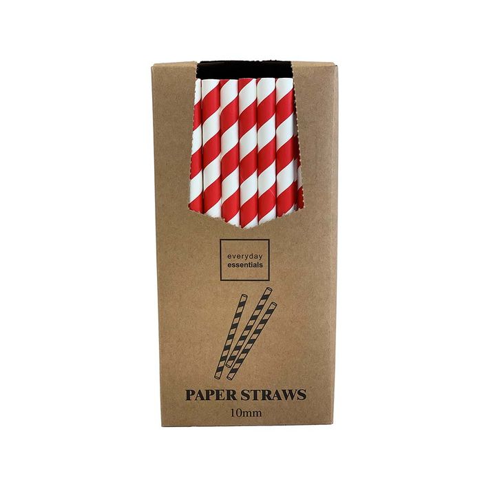 Packaged in handy carboard dispensing boxes of 100 straws Individually wrapped straws Dimension 10mm dia x 197mm length 120 + 120 + 60 GSM paper Food grade soy-bean ink colouring Red and white twisted Stripe design - colour (186c) 100 straws per kraft paper box 50 boxes per carton 5000 staws per carton No plastic!