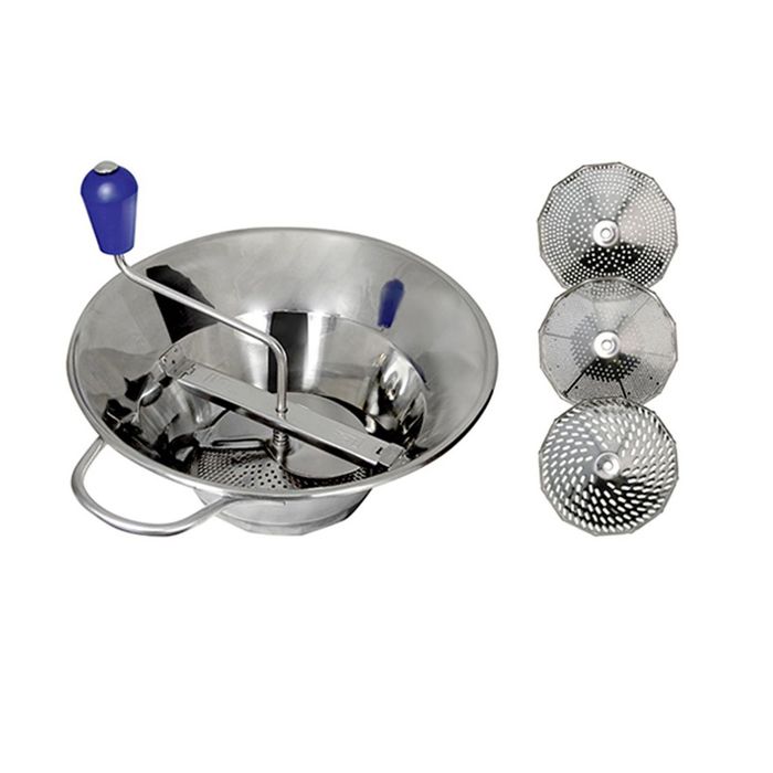 Professional manual food mill in stainless steel, designed for heavy use. Perfect for making purées, sauces, soups, fish soups... Professional mill and 3 sieves included Ø1.5mm, 2.5mm and 4mm. Other sieves available, sold separately: perforations of different size for 5 possible grains (Ø 1mm, 2mm, 3mm). Quick and easy assembly and disassembly. Hygienic mill that can be sterilised. Mill and sieves are dishwasher-safe. Interior Diameter 0cm Interior Length 0cm Interior Width 0cm Interior Height 0cm Interior Capacity 0cm Exterior Diameter 31.5cm Exterior Length 36.2cm Exterior Width 31.5cm Exterior Height 24cm Bottom Diameter 0cm Bottom Thickness 0cm Net weight 1.85kg