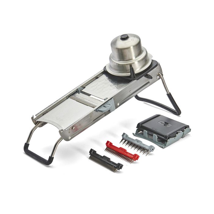 REVOLUTION : a new double horizontal blade, scalloped and fluted/serrated to cut all fruits and vegetables, even the softness, and citrus fruits. 3 Julienne combs: 2, 4 and 10 mm - Comes with a cube system (patented system) for cutting cubes 2, 4 and 10 mm and lozenges. Grooved plate for a better slide. Julienne blade stand embedded in the frame. Composite carriage and round pusher in brushed stainless steel with rotation control system for easy and smooth cutting of cubes and lozenges. In stainless steel and composite polymers. Brushed satin stainless steel look For smooth or wavy round slices, julienne cuts of 2, 4, 7 or 10 mm, waffle cut, cubes, lozenges. Slices up to 10 mm. Care: wash the blades by hand. The frame is dishwasher-safe. Interior Diameter 0cm Interior Length 38cm Interior Width 12.5cm Interior Height 13cm Interior Capacity 0cm Exterior Diameter 0cm Exterior Length 50cm Exterior Width 18.5cm Exterior Height 18cm Bottom Diameter 0cm Bottom Thickness 0cm Net weight 1.99kg