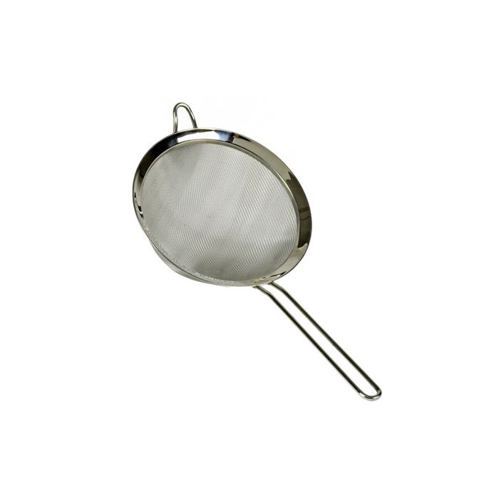 This single fine mesh strainer features an easy-to-grip wire handle for convenient storage, along with a large hook on the head for hanging on bowls while in use. 18cm dia.