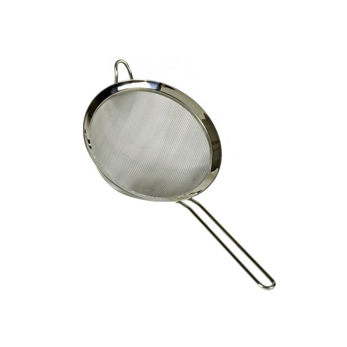 This single fine mesh strainer features an easy-to-grip wire handle for convenient storage, along with a large hook on the head for hanging on bowls while in use. 20cm dia.