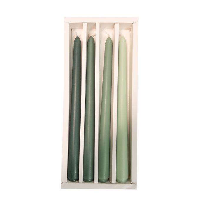 Create a stunning ombré display with this beautifully coordinated set of taper candles. Each 250mm candle is a solid color, but together they form a captivating gradient effect that flows seamlessly from deep to light tones. This elegant 4-pack features four solid-colored candles that create a gradient effect: Dark Green: Deep Forest Green Pine Green Sage Green: Soft Muted Green Light Green: Soft Pastel Green Premium Quality: High-grade wax ensures clean, even burning Perfect Height: 250mm length provides hours of ambient lighting Coordinated Colors: Four complementary shades create beautiful visual flow Versatile Display: Use all four together for gradient effect, or individually for accent lighting Standard Fit: Compatible with most taper candle holders. Burn time: Approximately 8-10 hours per candle
