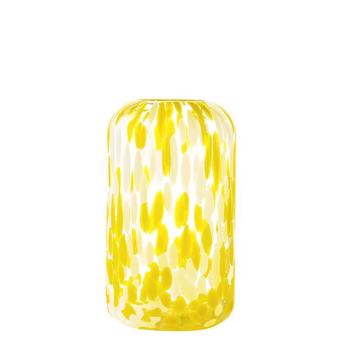 ASD10282 ASD Lava Vase Small Yellow The Lava collection is a vibrant fusion of colour and form inspired by the mesmerizing flow of molten lava. The coloured chips are hand applied, giving each mouth blown vase its own unique pattern. Available in blue, pink and green, these rich, dynamic hues, create a striking interplay of light and texture. Designed to stand out, Lava vases add a bold, artistic statement to any interior, whether showcasing fresh blooms or serving as a captivating centrepiece on their own. Contemporary shaped vase with hand-rolled coloured chips Mouth blown and handmade by skilled craftsmen Hand wash recommended Gift Boxed Designed in the UK Weight: 1000 g Dimensions: 125 × 125 × 210 mm Colour: Clear, Yellow, White Substrate: Glass