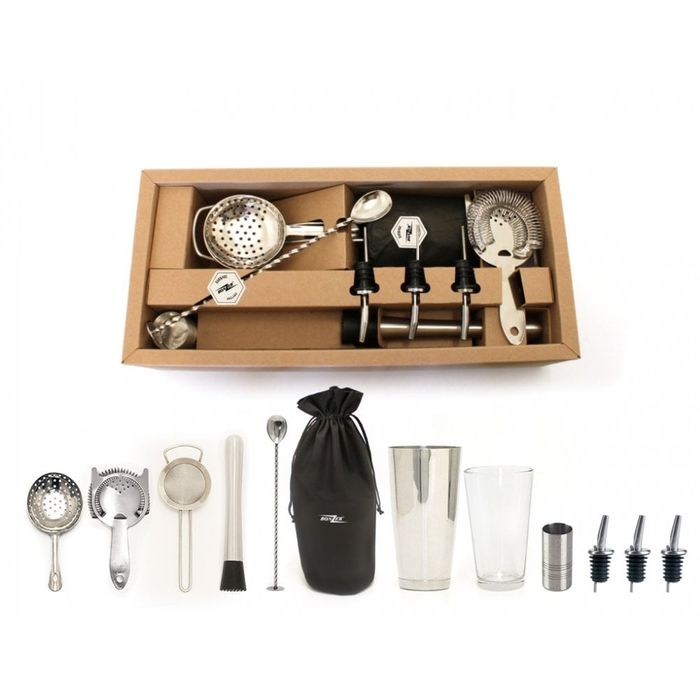The Bonzer Cocktail Kit includes everything you need to make cocktails at home or in your bar. To create the kit, we spoke to the top professional London mixologists and asked them what they thought were the most important pieces of equipment. Our kit includes their favourite items. If you’re considering creating cocktails in your bar or you want to be able to impress your friends and family at home, this kit has everything you’ll need. With the Bonzer Cocktail Kit you’ll be able to: Accurately measure shots for drinks with the 25 ml and 50 ml jiggers Perfectly mix ingredients with the Boston Shaker Get rid of any unwanted seeds or residue from juices with the Fine Bar Strainer Crush fruit and sugar to the perfect consistency with the cocktail muddler Stir drinks in a long glass with our long mixing spoon Features: 25 / 50 Jigger Spill-Stop Pour x 3 Muddler boston can boston Glass bonzer® Mixing Spoon bonzer® Hawthrone Strainer Julep Strainer Fine bar Strainer